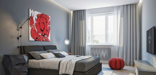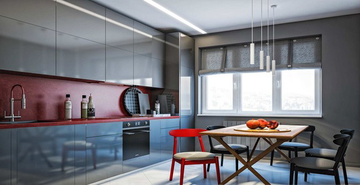 Много пространства, функциональная мебель. Доминирует насыщенный серый цвет, на его фоне выгодно смотрится красный, двухуровневая покраска стены в гостиной, прямые линии и минимум декора – все это выражено в современном стиле. Заниженная мягкая мебель простых форм в тон стенам. Светильники стилистические разные, но хорошо сочетаются друг с другом. Очень стильное и яркое решение. Этот стиль подходит для тех, кто ценит уют и комфорт, красоту и гармонию.