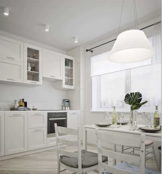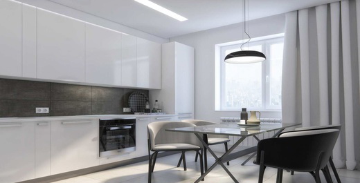 Свободное пространство, минимальное количество мебели и декора создадут уют и утонченность вашему дому. Отсутствие деталей декора порадуют любителей простора. Кухня создана для любителей кулинарии: большое пространство для хранения, много рабочих поверхностей и оригинальный светильник приглашают провести тут как можно больше времени.